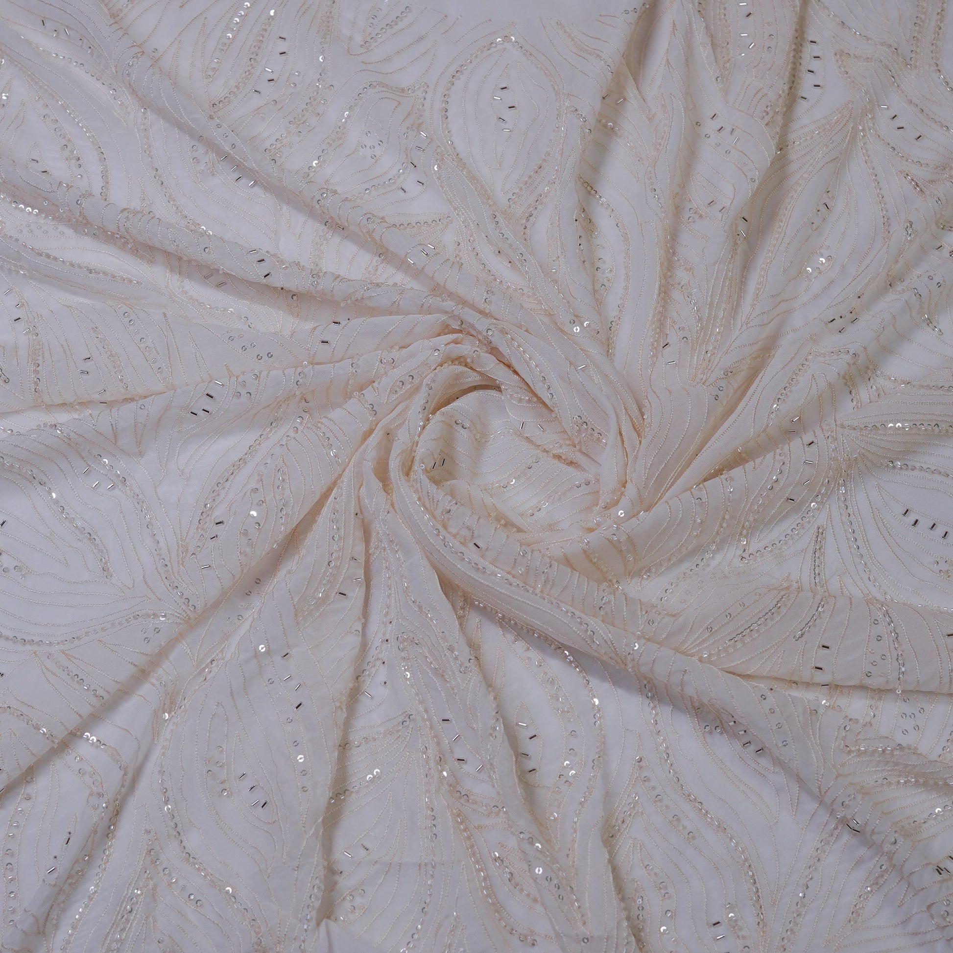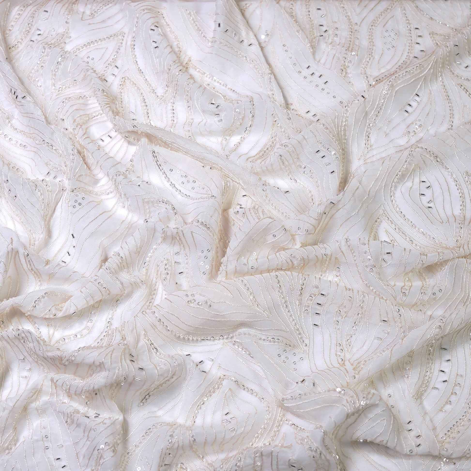 Premium quality off-white fabric featuring intricate paisley embroidery enhanced with delicate sequins and subtle bead detailing. The tone-on-tone design gives a rich and sophisticated look, making it perfect for bridal wear, lehengas, gowns, sarees, and designer suits. Its dyeable base allows you to customize the color as per your requirement, making it ideal for bespoke creations.